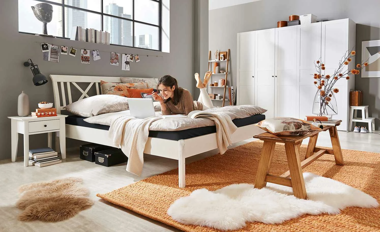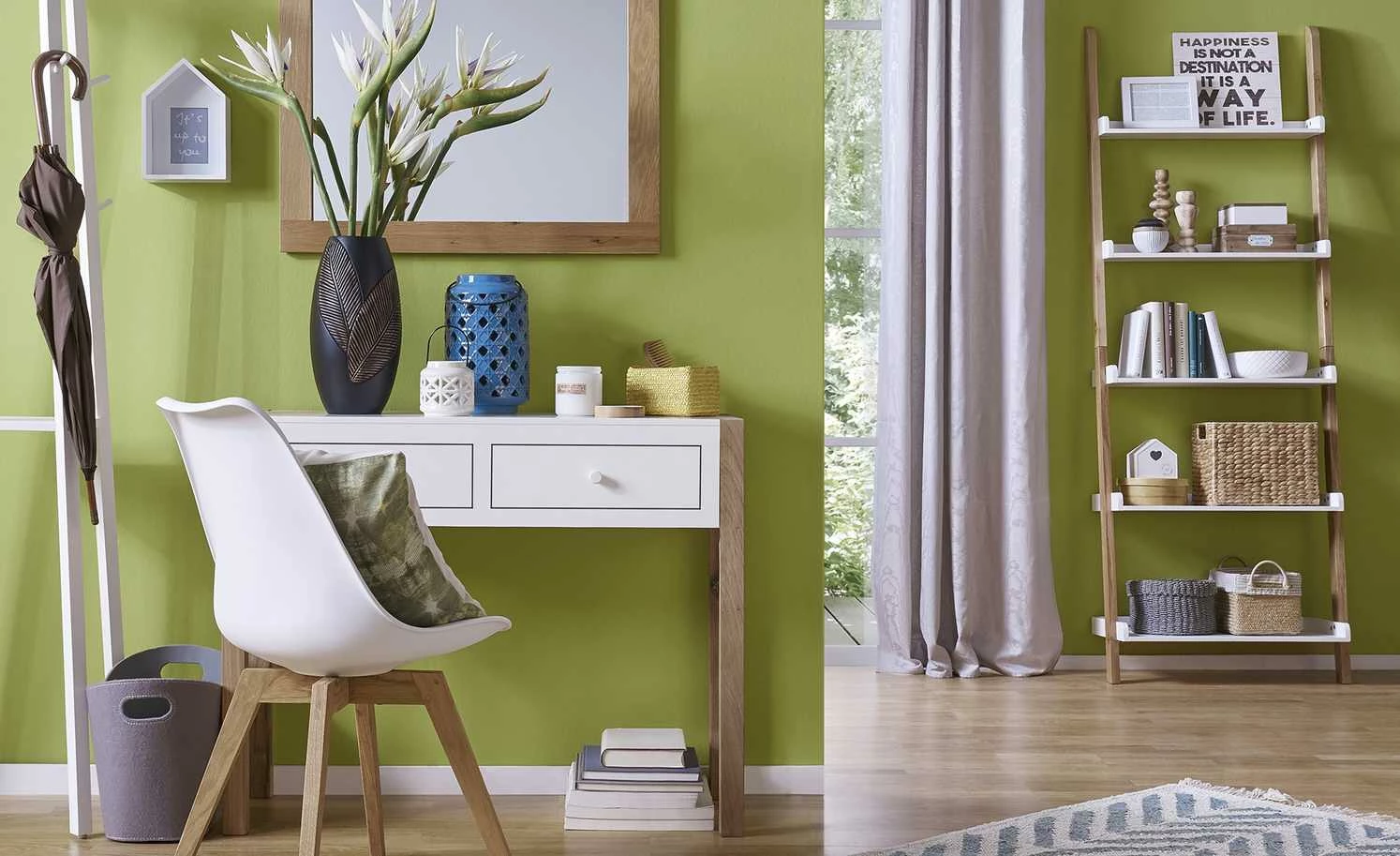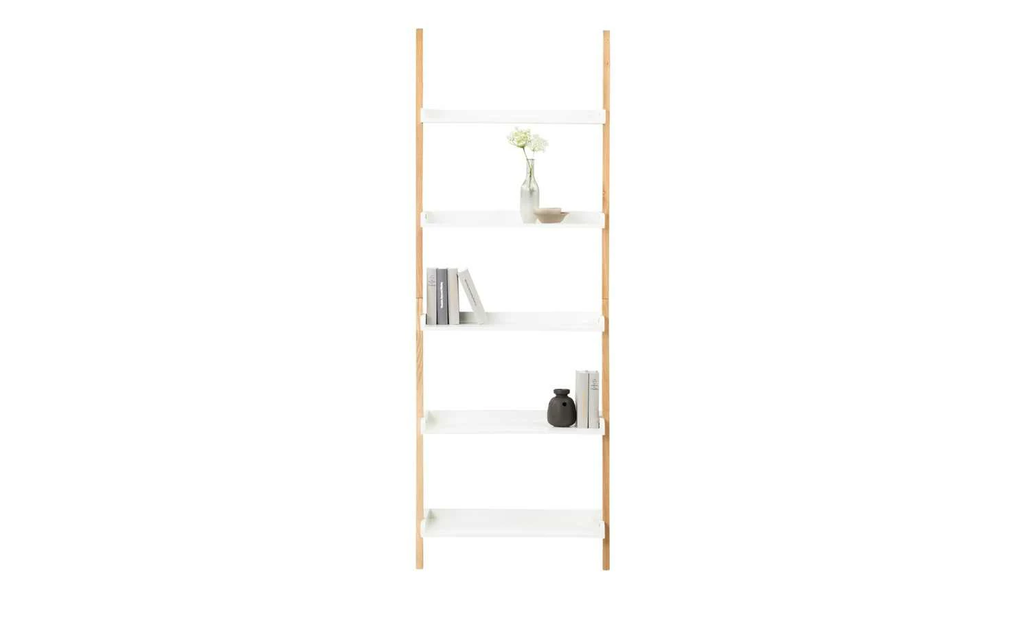 Wie eine an die Wand gelehnte Leiter sieht das Regal Bari aus. Das Gestell besteht aus massiver Eiche und ist im natürlichen Holzlook gehalten. Die fünf Regalböden sind weiß lackiert und setzen sich so schön vom Eichenholz ab. Die Böden haben an drei Seiten eine höhere Kante, so dass alles, was Sie auf dem Regal aufbewahren wollen, sicher steht.
