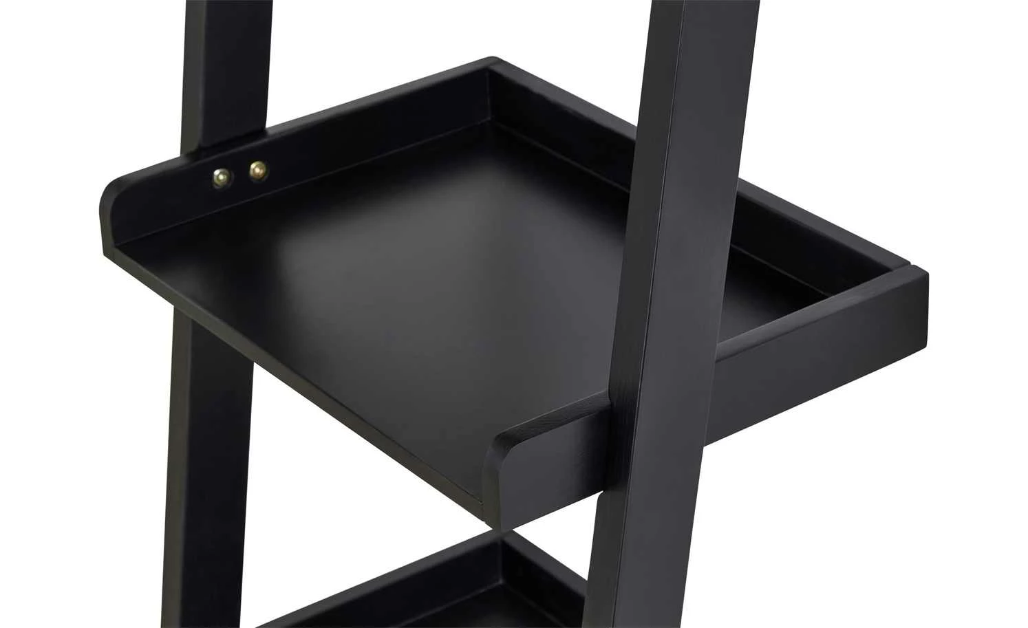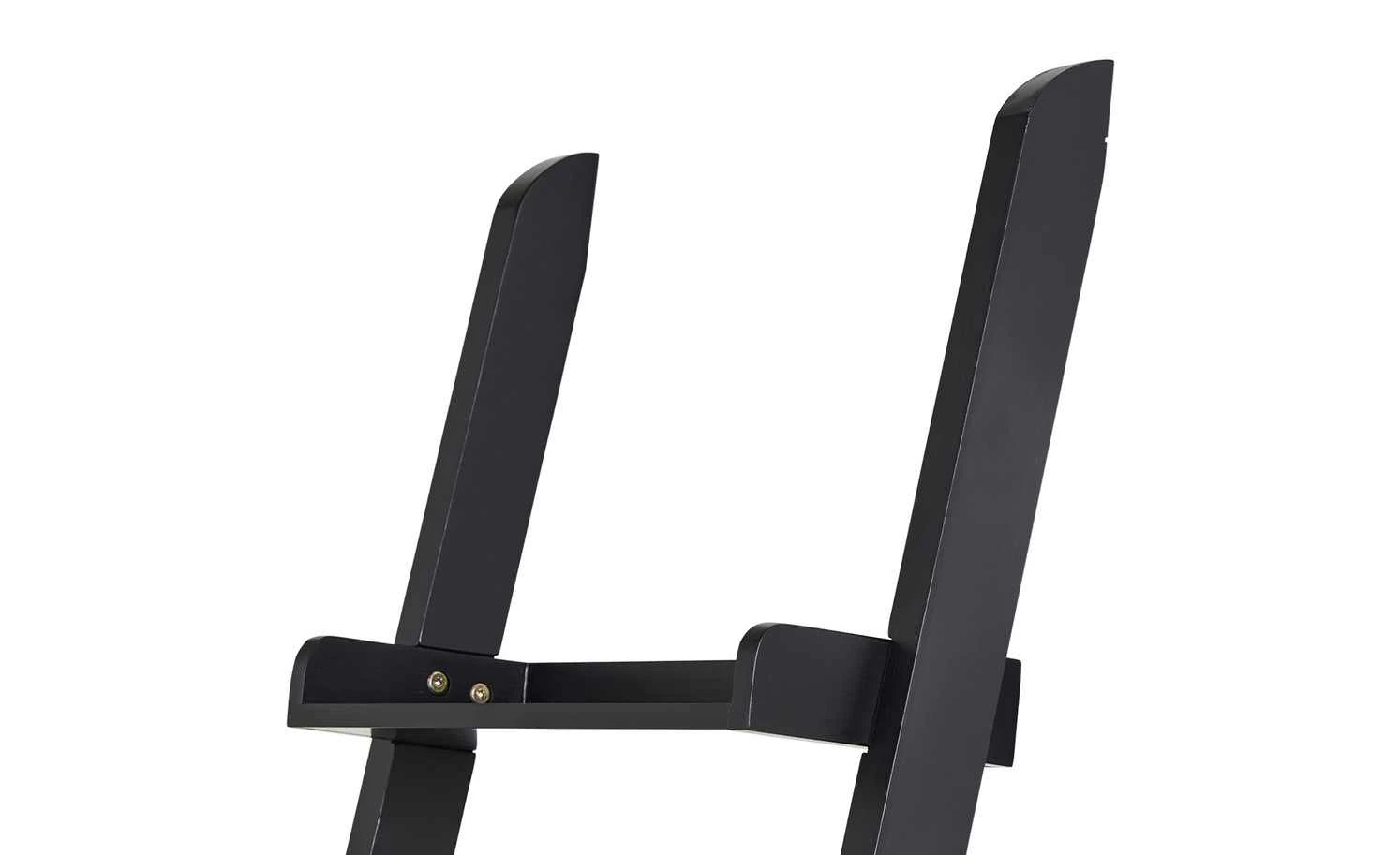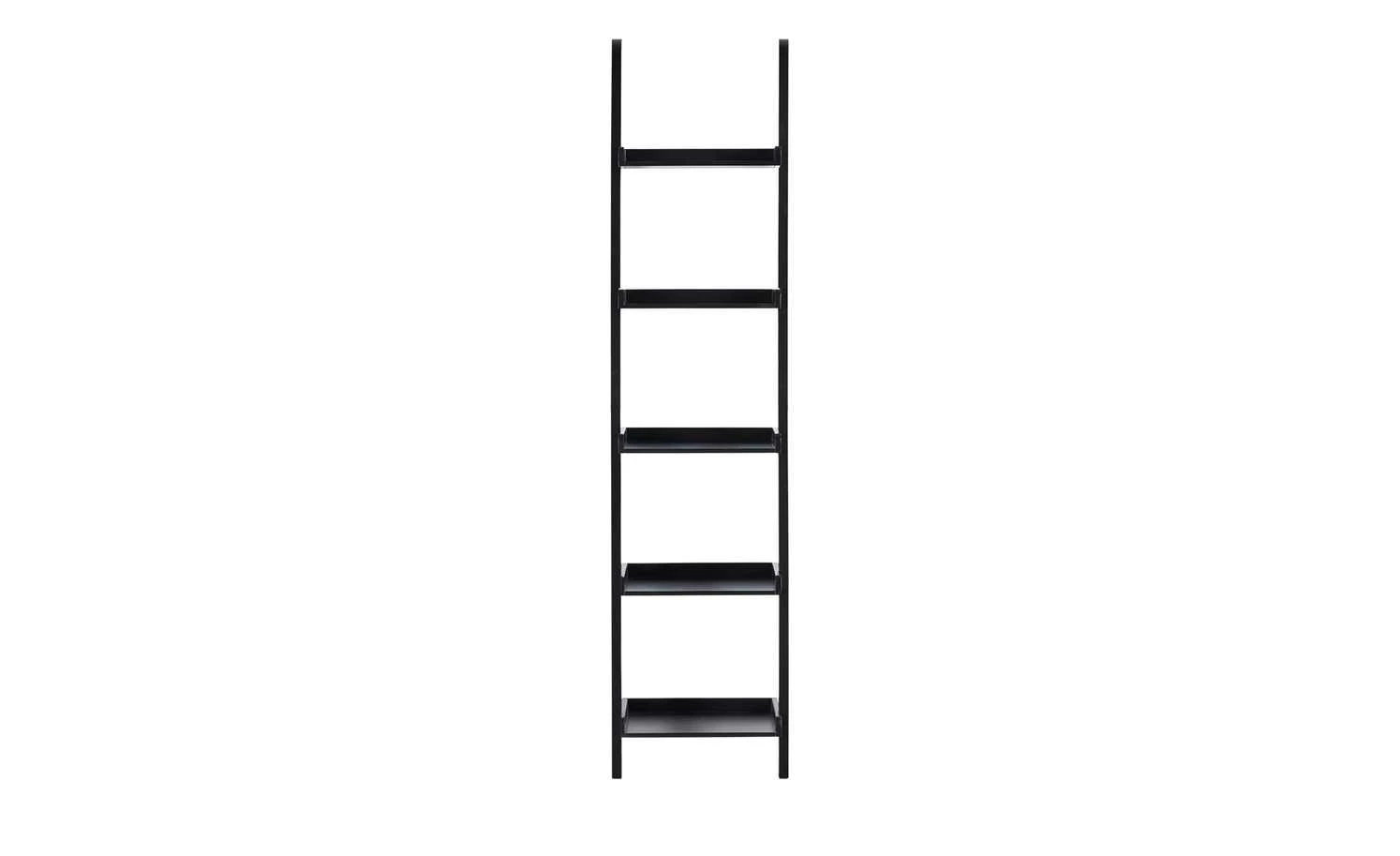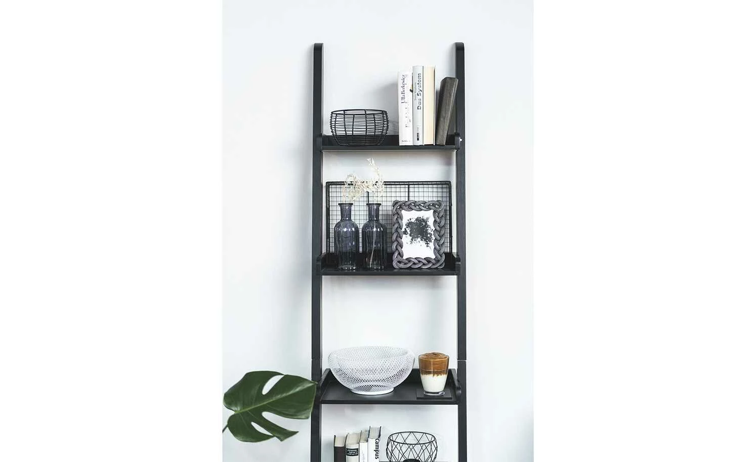 Das moderne Regal schmiegt sich wie eine Leiter an die Wand. Statt der Leitersprossen befinden sich in regelmäßigen Abständen jedoch fünf Regalböden zwischen den Holzlatten aus massivem Kiefernholz, die das Regal rechts und links begrenzen. Der untere Boden ist am tiefsten, nach oben hin werden die Böden immer schmaler. Bücher und Bildbände oder dekorative Gegenstände wie Bilderrahmen und Vasen werden im Leiterregal gut in Szene gesetzt. Eine dreiseitige Begrenzungsleiste verhindert das Herunterfallen von Gegenständen.