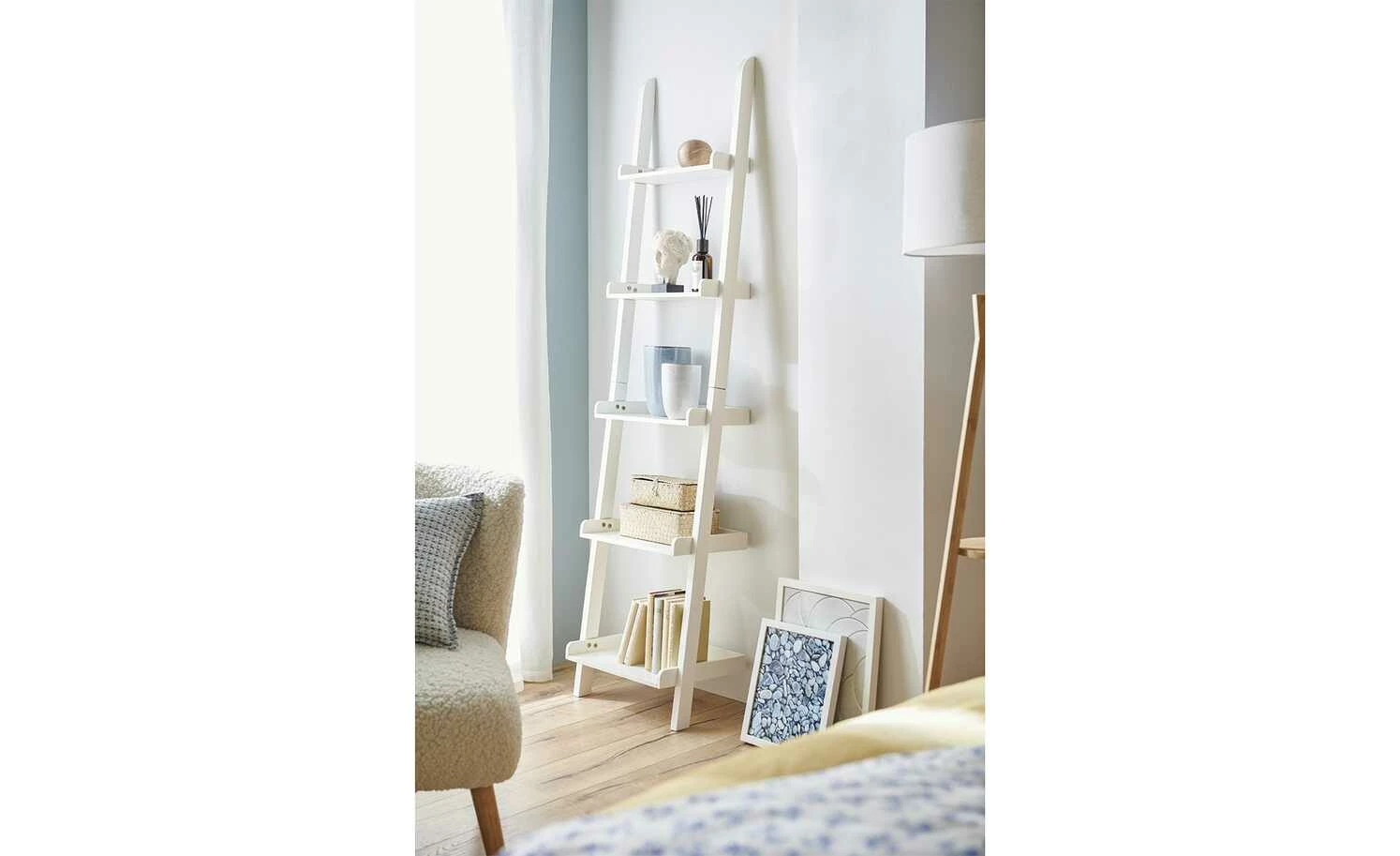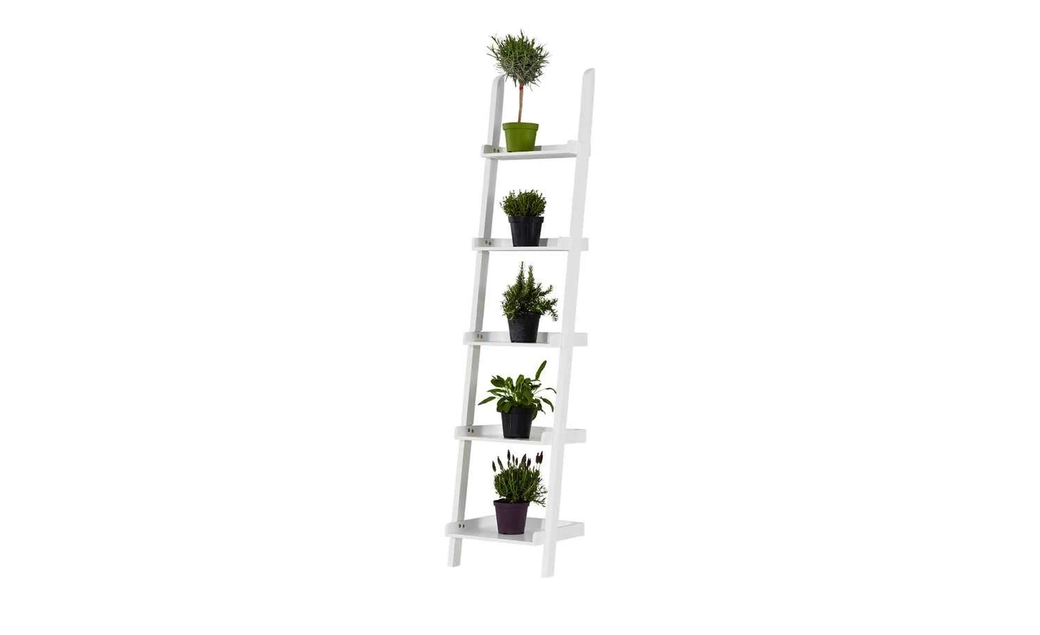 Das moderne Regal schmiegt sich wie eine Leiter an die Wand. Statt der Leitersprossen befinden sich in regelmäßigen Abständen jedoch fünf Regalböden zwischen den Holzlatten aus massivem Kiefernholz, die das Regal rechts und links begrenzen. Der untere Boden ist am tiefsten, nach oben hin werden die Böden immer schmaler. Bücher und Bildbände oder dekorative Gegenstände wie Bilderrahmen und Vasen werden im Leiterregal gut in Szene gesetzt. Eine dreiseitige Begrenzungsleiste verhindert das Herunterfallen von Gegenständen.