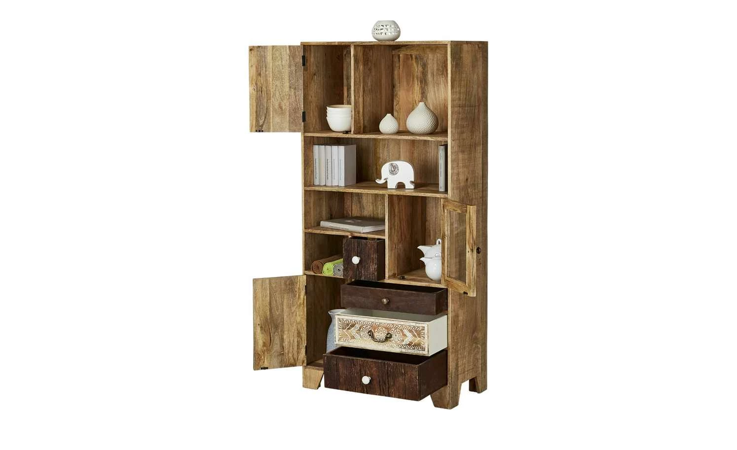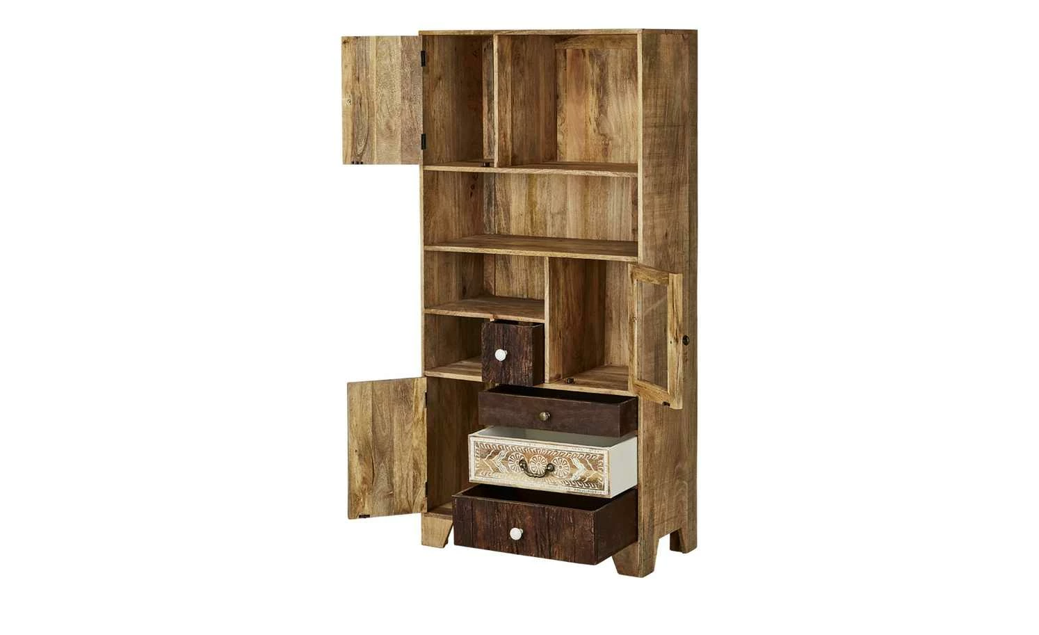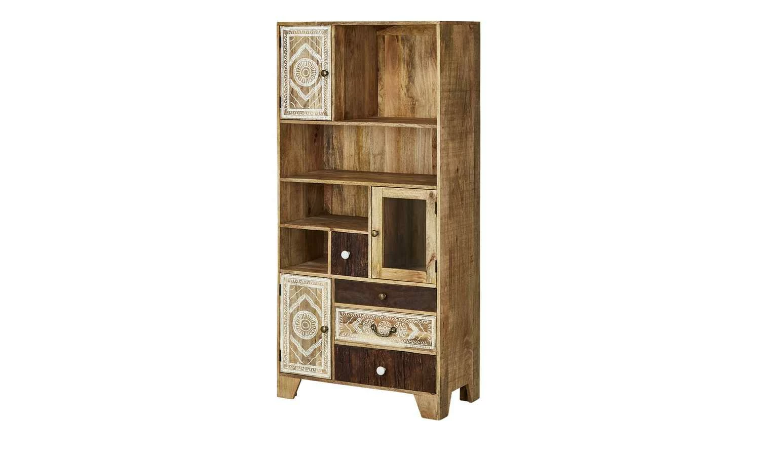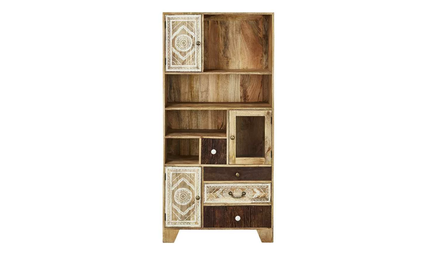 Delhi ist ein hochwertiges Regal mit exotischer Optik. Die Front ist detailreich und liebevoll verziert. Zum Teil hat sie eine Altholzoptik. Für die Front wurde Akazie verwendet. Der Korpus besteht aus massivem Mangoholz. Korpus und Front sind gebeizt und lackiert. Delhi hat vier offene Fächer in unterschiedlicher Größe. Zudem können Sie vier Schubladen und drei Türen nutzen. Eine der Türen ist mit einem Glaseinsatz versehen.