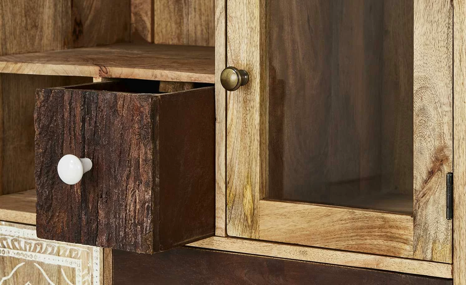 - Mehr zum Material: Griffe aus Metall, teilweise lackiert, Türen und Schubladenfronten aus Akazie massiv, 1 Tür mit Glas, Rückwand MDF