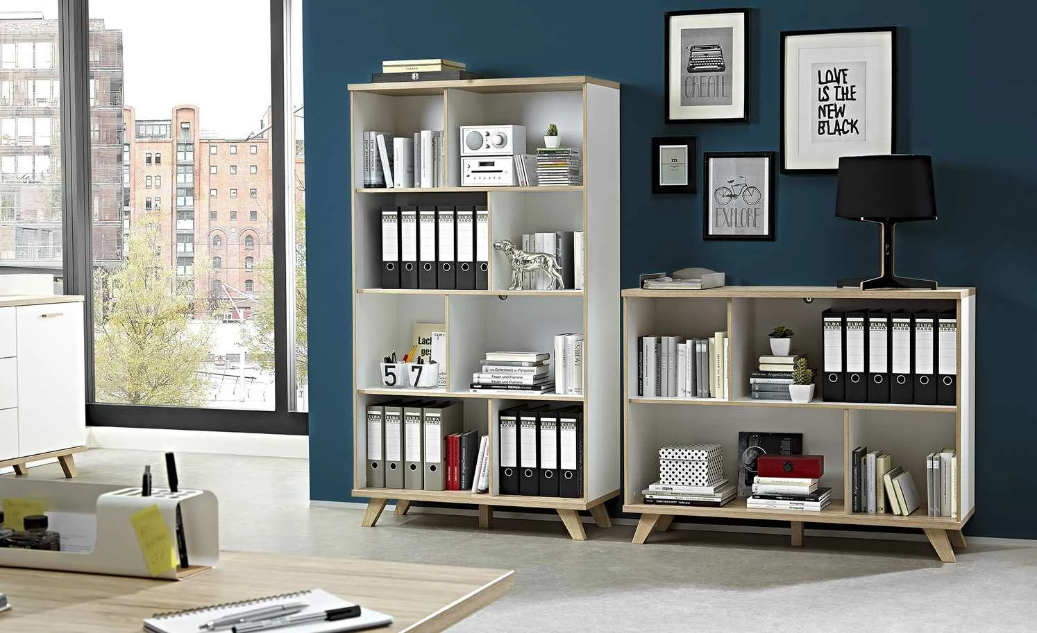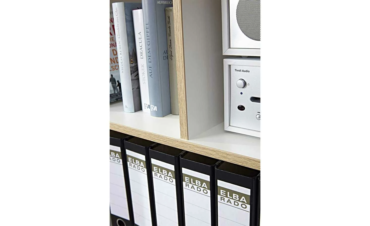 Das Regal Oslo besticht durch ein modernes und frisches Design. Es ist in den Farben Weiß und Hellbraun gestaltet. Vier Regalböden sorgen für genügend Stauraum. Dabei können Ordner und Bücher ideal untergebracht werden. Dank der asymmetrischen Anordnung der Trennwände entsteht ein aufgelockertes Erscheinungsbild, das dem Regal einen besonderen Reiz verleiht. Ein weiteres interessantes Detail sind die fünf schrägen Füße. Sie können dieses Möbelstück zu vielen verschiedenen Farben und Stilen kombinieren. Dabei passt es besonders gut zu den Möbeln der gleichen Serie.