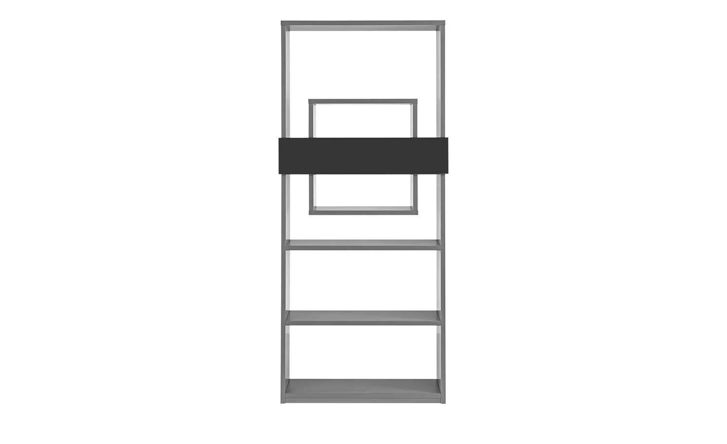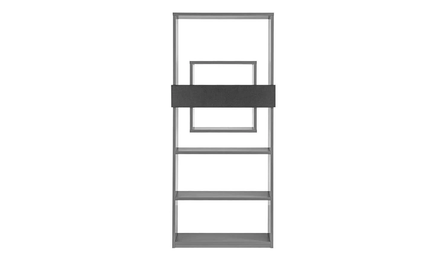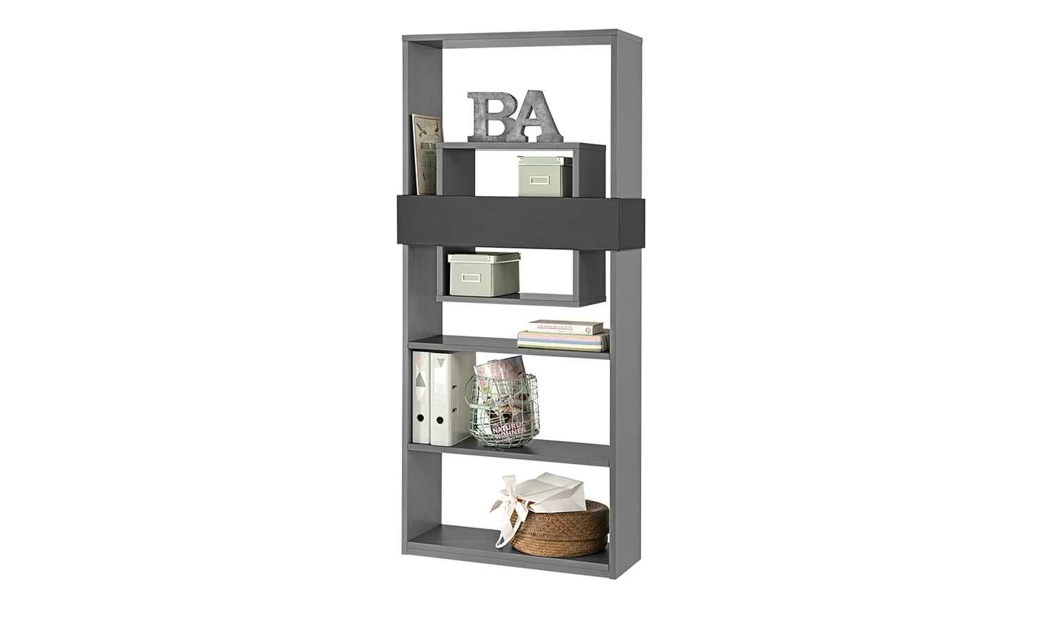 Stylisch geometrisch designt ist das Regal Holly. Es ist weiß und wird durch eine farblich abgesetzte Bauchbinde akzentuiert. Sechs Fächer können Sie für Bücher, gerahmte Fotos oder Deko nutzen.