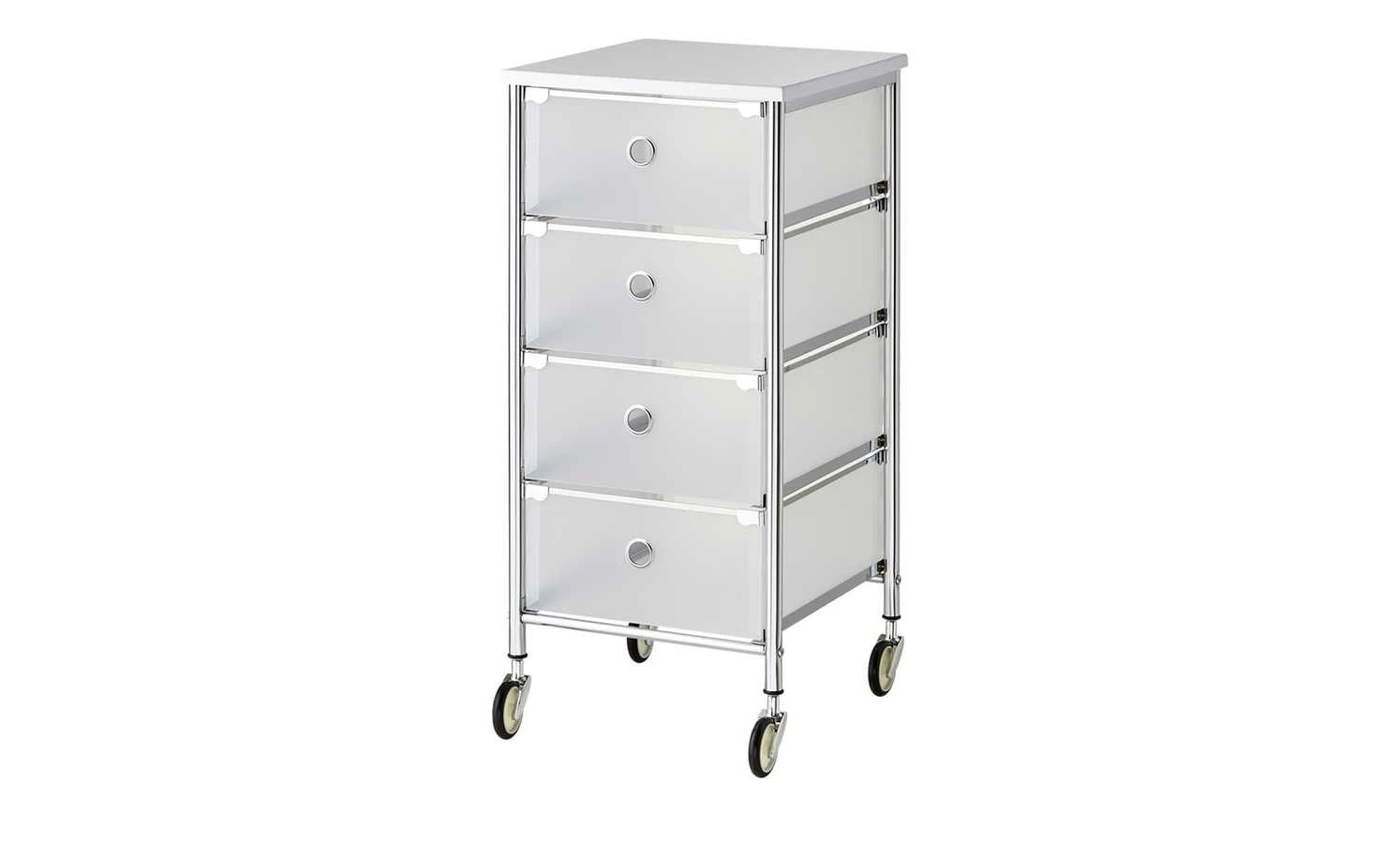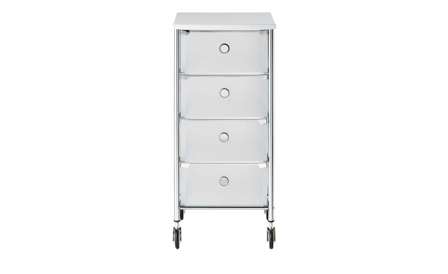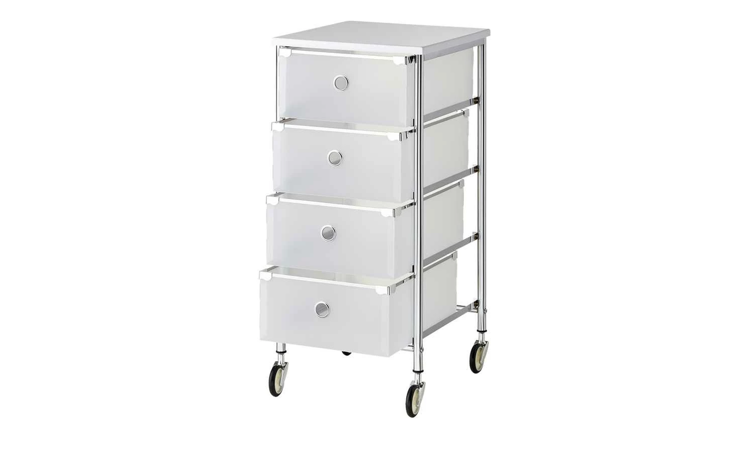 Den Rollcontainer Ronda können Sie in Schlafzimmer und Küche genauso nutzen wie im Bad. Wie die Bezeichnung schon verrät hat Ronda vier praktische Rollen, durch die Sie ihn einfach bewegen können. In den vier Schüben finden allerlei Dinge ihren Platz. Das Gestell ist aus Metall und verchromt, die Schübe bestehen aus Kunststoff. Die Abdeckplatte hat eine strahlende Hochglanz-Optik in Weiß.