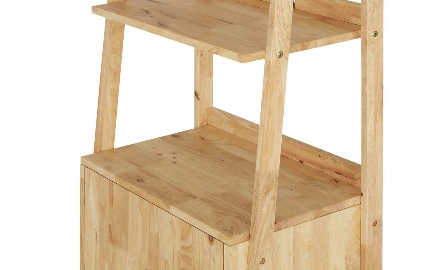 Das Standregal Nate überzeugt mit seinem natürlichen, freundlichen Design. Das 180 Zentimeter hohe Regal besteht komplett aus unbehandeltem, schön gemasertem Gummibaumholz. Auf vier Etagen steht Ihnen Stauraum für Dekoration, Bücher und vieles mehr zur Verfügung. Im unteren Bereich finden Sie zwei weitere Fächer, die durch eine blickdichte Holztür verborgen sind. Das Standregal Nate ist ein wahrer Wandlungskünstler: Mit nur wenigen Handgriffen lässt sich der obere Bereich vom Hauptregal trennen. Das obere Stück mit den zwei offenen Regalen eignet sich dann perfekt als Pflanzentreppe und Blumenbank.