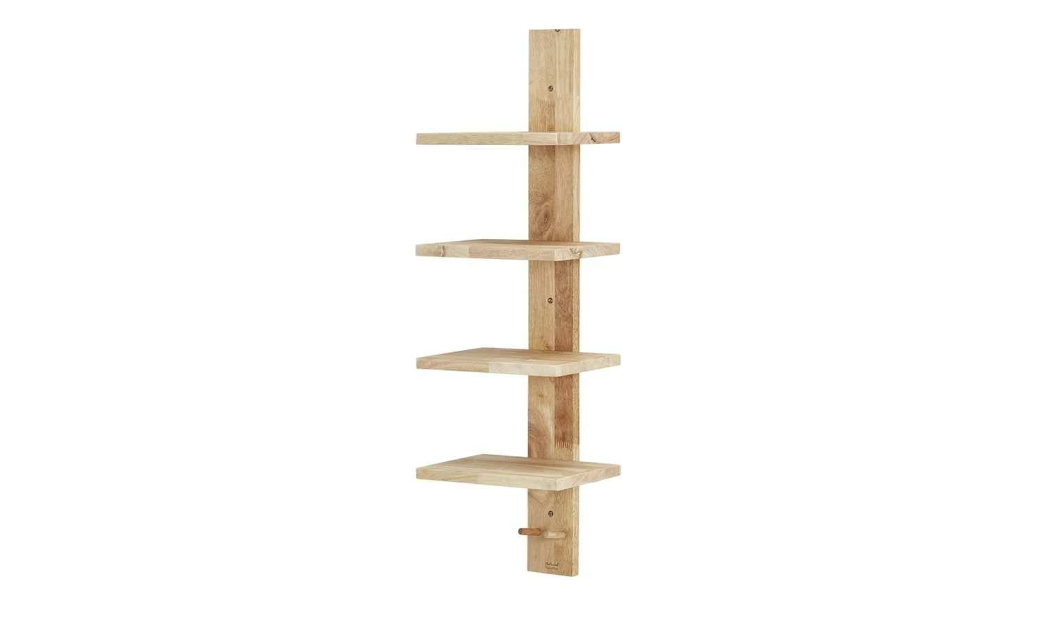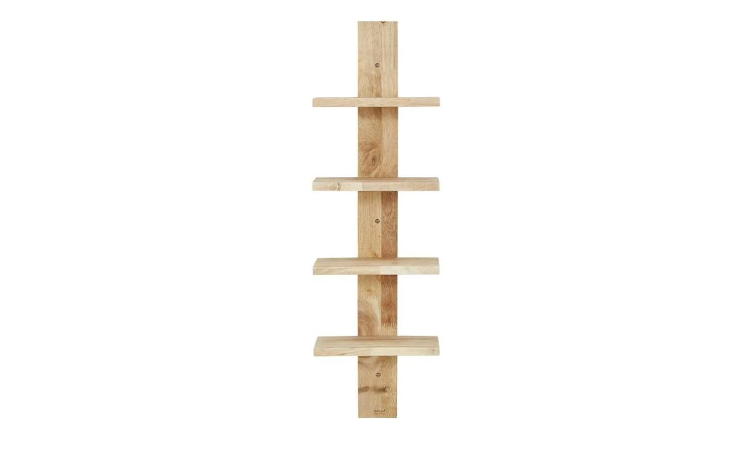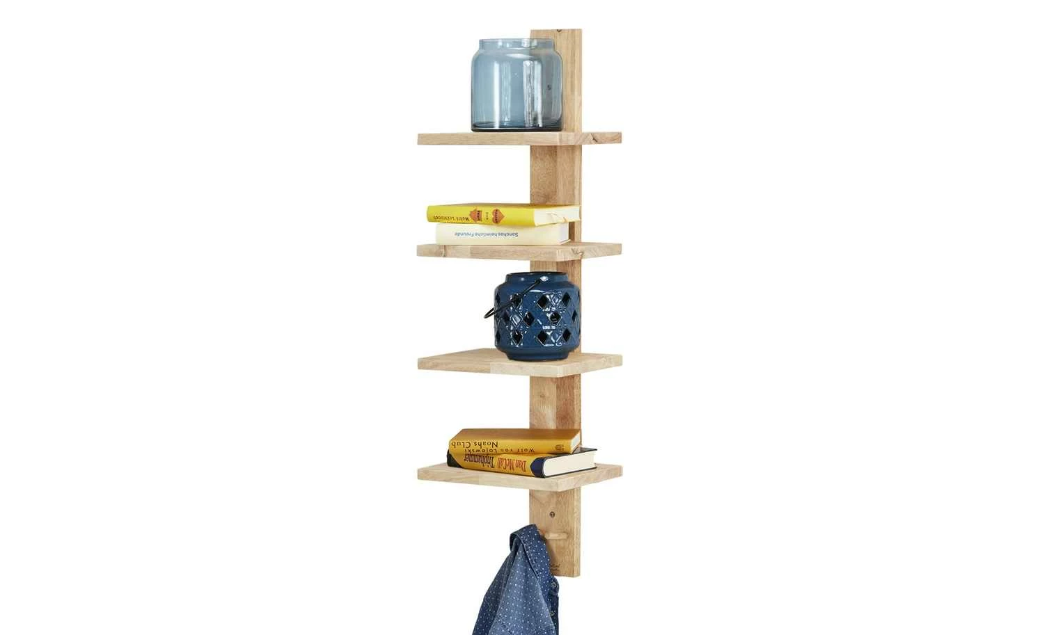 Schön gemasertes, unbehandeltes Gummibaumholz macht das Wandregal Nate zu einem natürlichen Hingucker in Fluren und Wohnräumen. Das Wandregal besitzt vier Böden, auf denen Bücher, Urlaubsandenken und andere Dekoartikel in Szene gesetzt werden können. Dank der zwei Haken im unteren Bereich macht sich das Wandregal auch gut als Kindergarderobe. Bringen Sie das Wandregal dazu einfach in kindgerechter Höhe neben Ihrer Garderobe an: Dann können die Kleinen ihre Sachen ganz allein aufhängen.