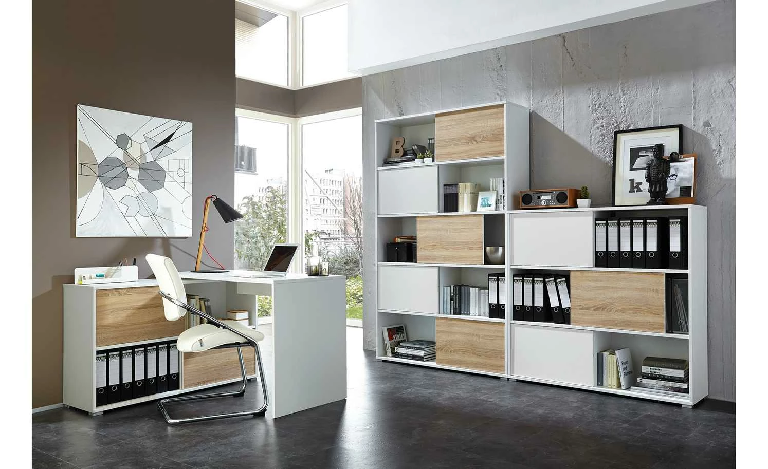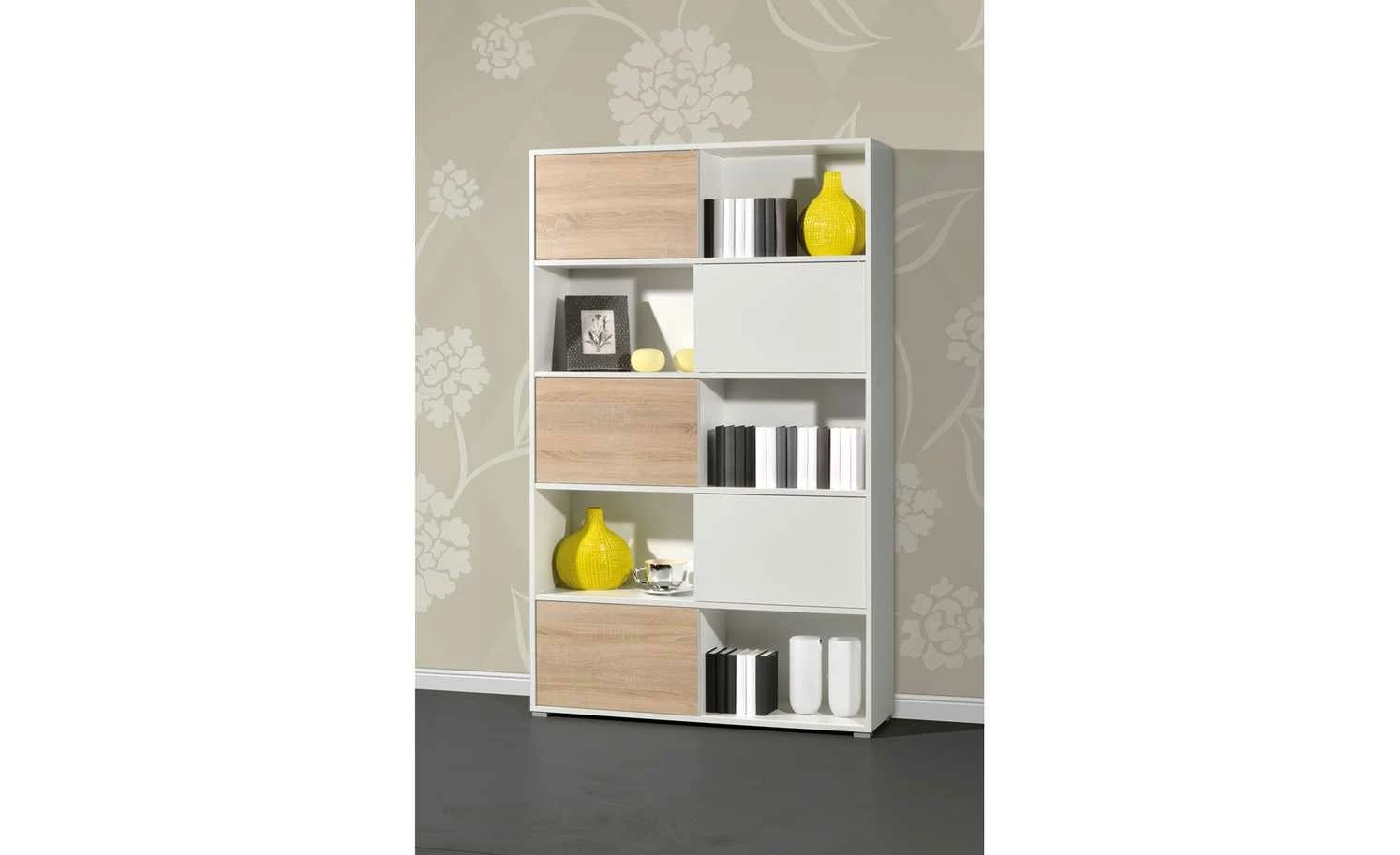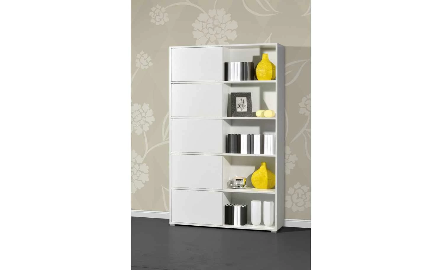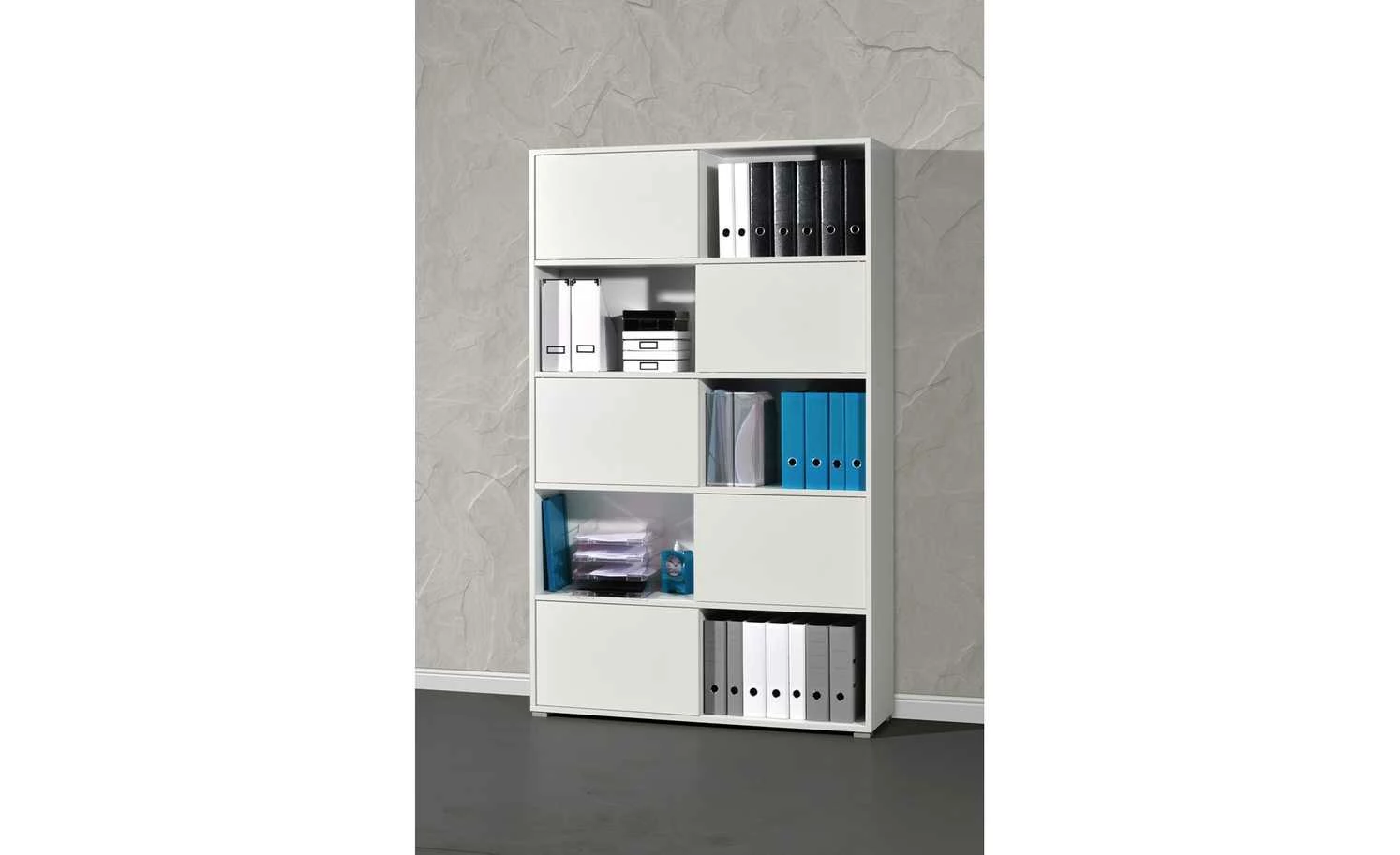 Mit diesem Schiebetürregal steht Ihnen ein flexibles Büromobiliar in einem zeitgemäßen Design zur Verfügung. Auf fünf ausladenden Böden bietet Ihnen das Regal reichlich Stellfläche für Aktenordner, Bücher oder sonstiges Büromaterial. Pfiffig ist das Konzept mit den fünf Schiebetüren, die immer nur die Hälfte einer Regalebene verdecken. Sie können nach Belieben positioniert werden und damit stets einen anderen optischen Eindruck entstehen lassen. Durch eine zusätzliche Wendeoption bieten die Türen zahlreiche Kombinationsmöglichkeiten. Das Schiebetürregal GW-Slide verkörpert mit seinen raffinierten Elementen und einem geradlinigen Design einen attraktiven, modernen Einrichtungsstil.