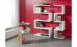S-förmig angeordnete Platten mit Kunststoffoberfläche setzen sich zu einem charmanten Regal zusammen. Die auf diese Weise entstehenden Ablagefächer werden mit je zwei dünnen Metallstäben an der offenen Seite stabilisiert. Die fünf breiten waagerechten Elemente bilden praktische Ablageflächen für Bücher, dekorative Kartons und Schalen, Bilderrahmen und Vieles mehr.