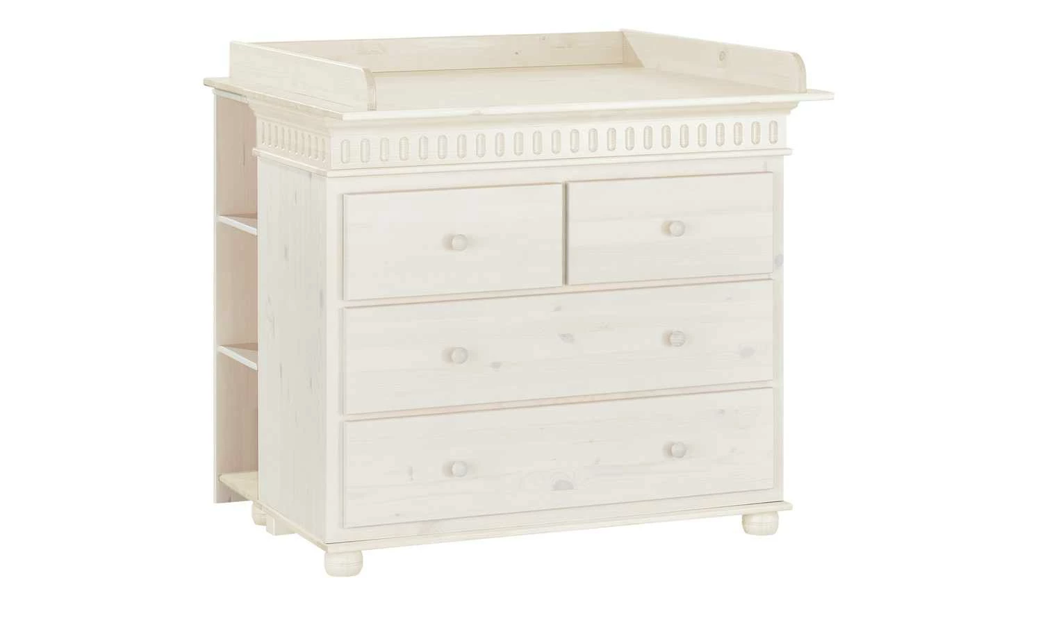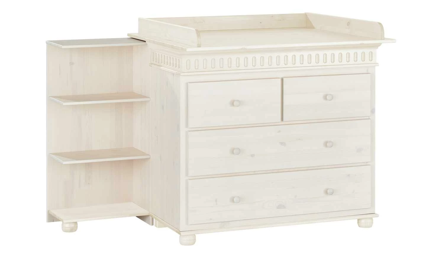 Sie benötigen mehr Ablagefläche für Babypuder und andere Pflegeprodukte? Dann ist das Unterstellregal Bornholm genau richtig. Sie stellen es einfach seitlich an und leicht unter die Wickelkommode, so dass es mit dem Wickelansatz abschließt. Bornholm besteht aus massiver Kiefer und ist weiß gewachst. Die typische Kiefernholz-Maserung ist dennoch gut zu erkennen.