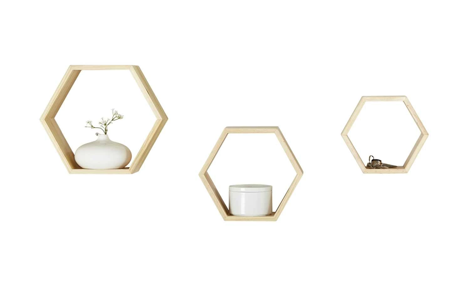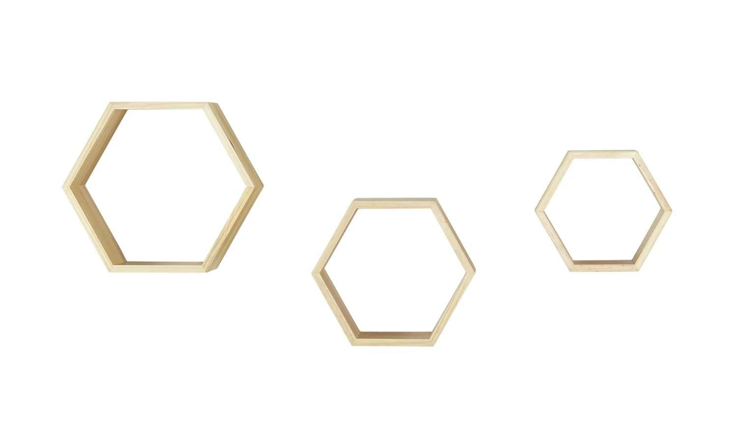 Die Wabenform macht das Regalset Finate zu einem besonderen Eyecatcher. Das Set besteht aus drei Regalen in drei unterschiedlichen Größen. Sie können einzeln, aber auch zusammen aufgehängt werden. Alle drei bestehen aus massiver Pinie.