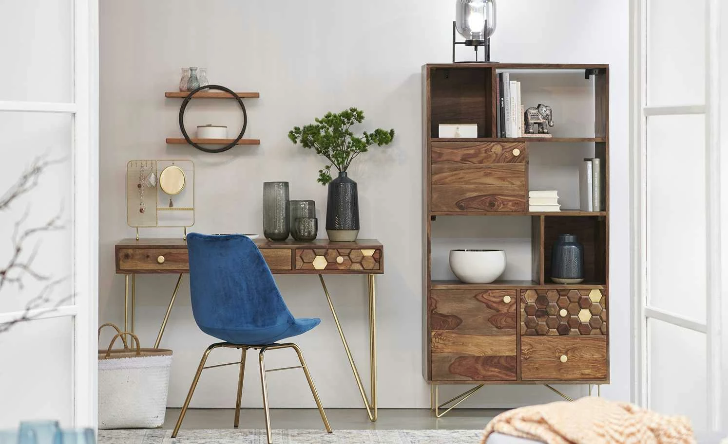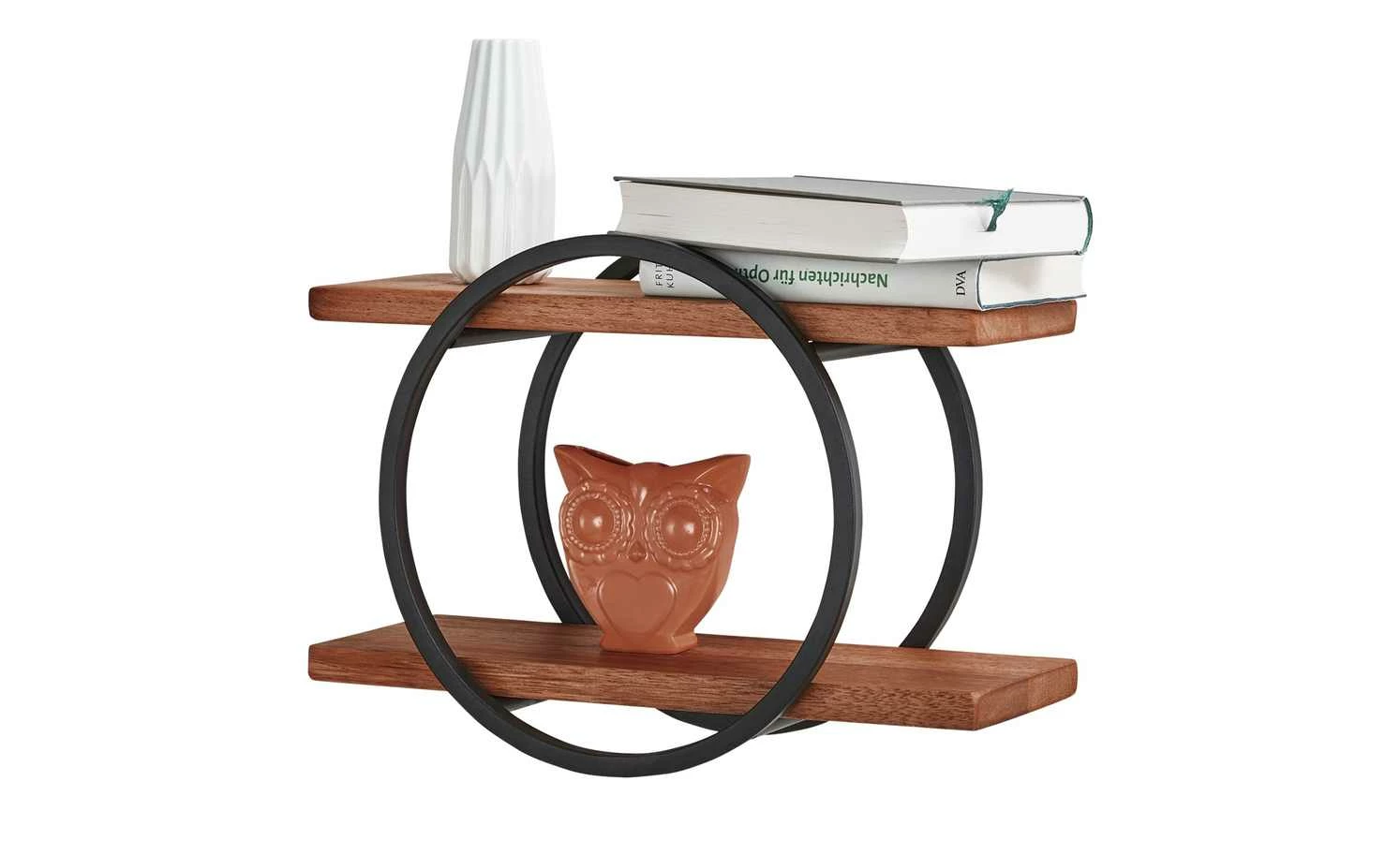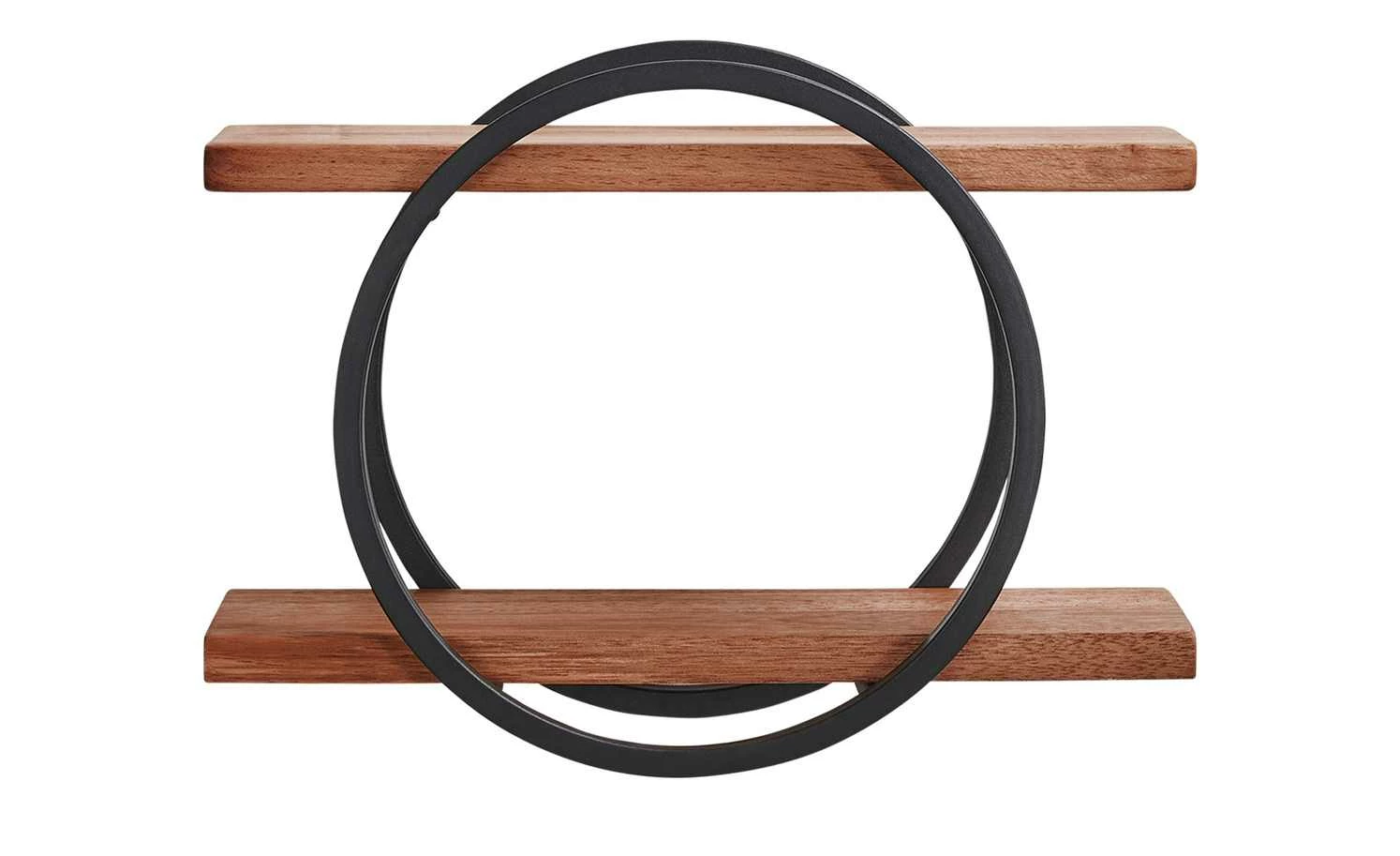 Der Mix aus runden und geradlinigen Elementen macht die Optik von Caprino aus. Das Wandregal verfügt über ein kreisrundes Metallgestell. Es hält zwei Regalböden aus Durianholz. Bei dem schön gemaserten Hartholz handelt es sich um eine Art Malvengewächs aus Südostasien.